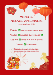 Le menu du nouvel an chinois a été servi lundi 16 février 2026. Selon l'astrologie chinoise, l'année 2026 sera placée sous le signe du Cheval et de l’élément Feu.